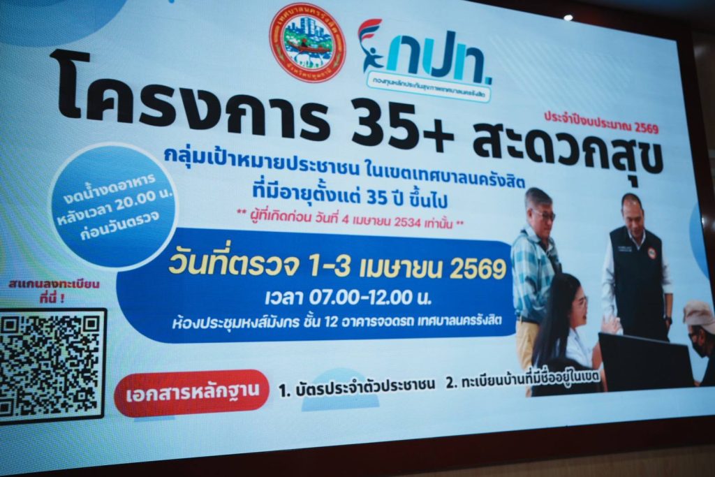 ร้อยตำรวจเอก ดร.ตรีลุพธ์ ธูปกระจ่าง นายกเทศมนตรีนครรังสิต มอบหมายคณะผู้บริหาร รองนายกเทศมนตรี สมาชิกสภาเทศบาล ที่ปรึกษากิตติมศักดิ์นายกเทศมนตรี ปลัดเทศบาล และหัวหน้าส่วนราชการ ลงพื้นที่ตรวจเยี่ยมการให้บริการตรวจสุขภาพตามโครงการ “35+ สะดวกสุข” ซึ่งจัดขึ้นเพื่อดูแลและส่งเสริมสุขภาพประชาชนในเขตเทศบาลนครรังสิตที่มีอายุ 35 ปีขึ้นไป โดยไม่เสียค่าใช้จ่าย