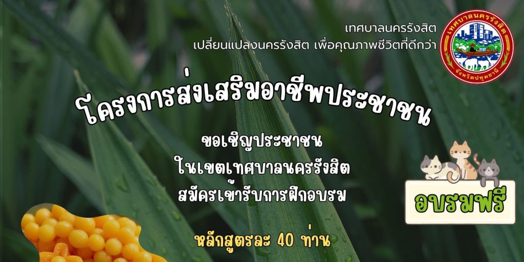 ขอเชิญชวนประชาชนในเขตเทศบาลนครรังสิต สมัครเข้ารับการฝึกอบรม (หลักสูตรละ 40 ท่าน) ดังนี้ #หลักสูตรที่1 การทำขนมทองหยิบ ทองหยอด 📅 วันเสาร์ที่ 9 พฤษภาคม 2569 🕔 เวลา 08.30 น. – 16.30 น. 📌 ณ ห้องประชุมมังกรทอง ชั้น 11 อาคารจอดรถเทศบาลนครรังสิต #หลักสูตรที่2 การทำขนมเม็ดขนุน ขนมลูกชุบ 📅 วันอาทิตย์ที่ 10 พฤษภาคม 2569 🕔 เวลา 08.30 น. – 16.30 น. 📌 ณ ห้องประชุมมังกรทอง ชั้น 11 อาคารจอดรถเทศบาลนครรังสิต #คุณสมบัติการสมัครเข้ารับการอบรม ㆍมีชื่ออยู่ในทะเบียนบ้าน ตำบลประชาธิปัตย์ ㆍไม่จำกัดอายุ ไม่จำกัดเพศ 📄 เปิดรับสมัคร ตั้งแต่วันที่ 7 – 30 เม.ย. 2569 ลิงค์สำหรับการลงทะเบียน https://forms.gle/UDDMn7ryuVZEhXQ3A ☎ ท่านที่สนใจสอบถามข้อมูลได้ที่ : กองสวัสดิการสังคม ชั้น 10 เทศบาลนครรังสิต โทร. 0 2567 6000 ต่อ 1007 และ โทร. 0 2567 6222 #เทศบาลนครรังสิต #เปลี่ยนแปลงนครรังสิตเพื่อคุณภาพชีวิตที่ดีกว่า #นายกโบว์ลิ่ง เผยแพร่โดย : งานประชาสัมพันธ์ ฝ่ายบริการและเผยแพร่วิชาการ กองยุทธศาสตร์และงบประมาณ ——————————– ติดตามข่าวสารเทศบาลนครรังสิต เพื่อไม่พลาดข่าวสารดีๆ 🌐 เว็บไซต์ : www.rangsitcity.go.th 🟢 Line Official : @rangsitcity (ใส่ @ข้างหน้า) หรือคลิกลิงค์ https://lin.ee/mNAHC1Z 🔵 Facebook Page : เทศบาลนครรังสิต คลิกลิงค์ https://www.facebook.com/rangsitcity2016 🔴 YouTube : เทศบาลนครรังสิต คลิกลิงค์ https://youtube.com/@rangsitcity2016/ ⚫ TikTok : https://www.tiktok.com/@rangsitcity_official 📲 แจ้งเรื่องร้องเรียน หรือ ขอรับบริการสาธารณะ ได้ที่ Rangsit City App ดาวน์โหลดแอปพลิเคชั่น Rangsit City App Apple Store (iOS) : ได้ที่ลิงค์ https://apps.apple.com/…/rangsit-city-app/id6472018970… Google Play (Android) : ได้ที่ลิงค์ https://play.google.com/store/apps/details… ☎ โทรศัพท์ : 0 2567 6000 📩 Email : saraban@rangsitcity.go.th 📲 แจ้งเหตุด่วน เหตุร้าย ไฟไหม้ ตลอด 24 ชั่วโมง – ศูนย์ควบคุมและสั่งการนครรังสิต (ศูนย์ RCC) โทร. 0 2567 6000 ต่อ 119 หรือ 0 2567 3388 – ศูนย์กู้ชีพเทศบาลนครรังสิต โทร. 0 2567 4944