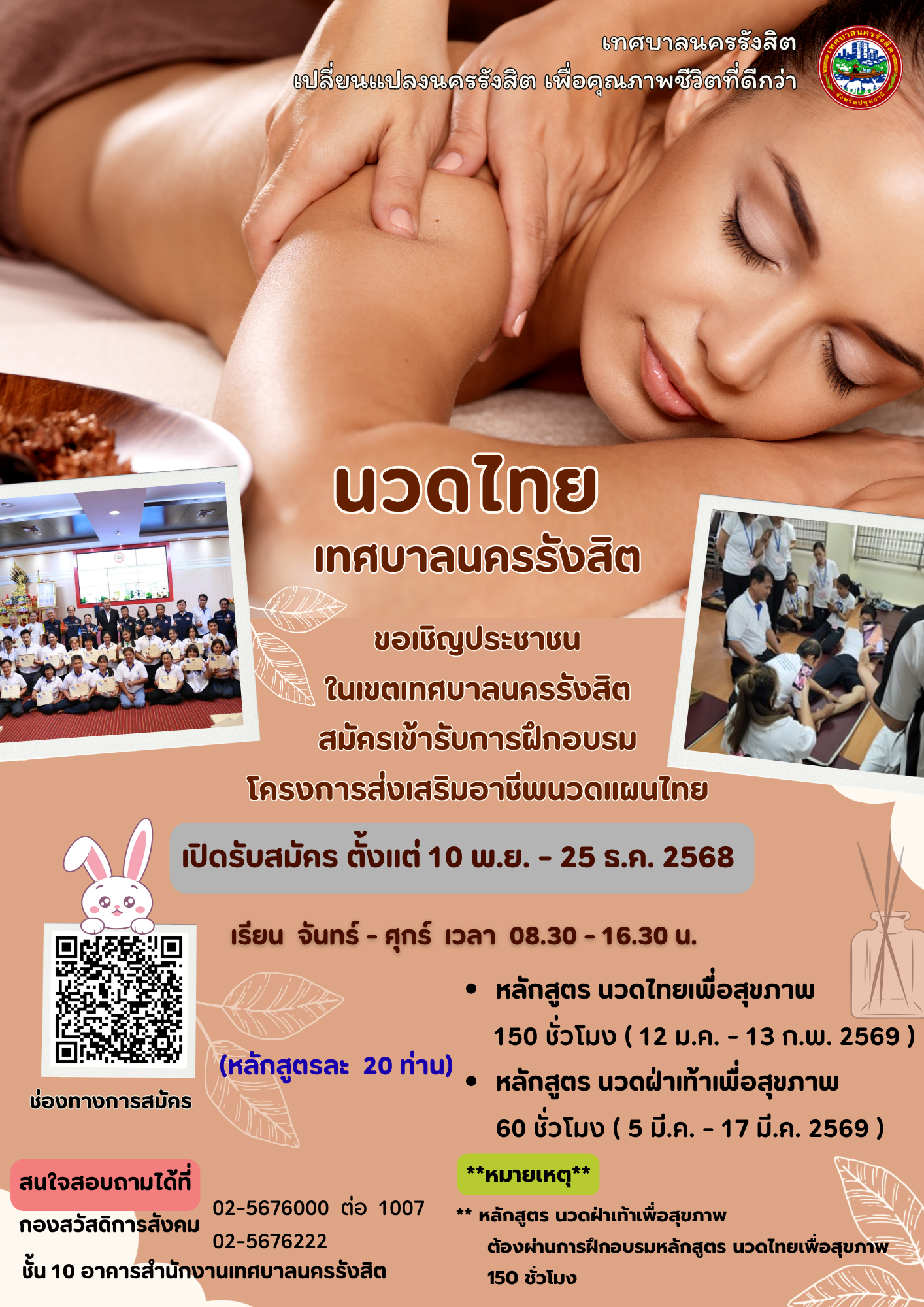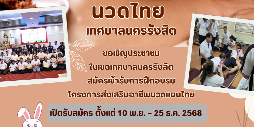 กองสวัสดิการสังคม เทศบาลนครรังสิต จัดทำโครงการส่งเสริมอาชีพนวดแผนไทย ประจำปีงบประมาณ 2569 หลักสูตรนวดไทยเพื่อสุขภาพ 150 ชั่วโมง และหลักสูตรนวดฝ่าเท้าเพื่อสุขภาพ 60 ชั่วโมง