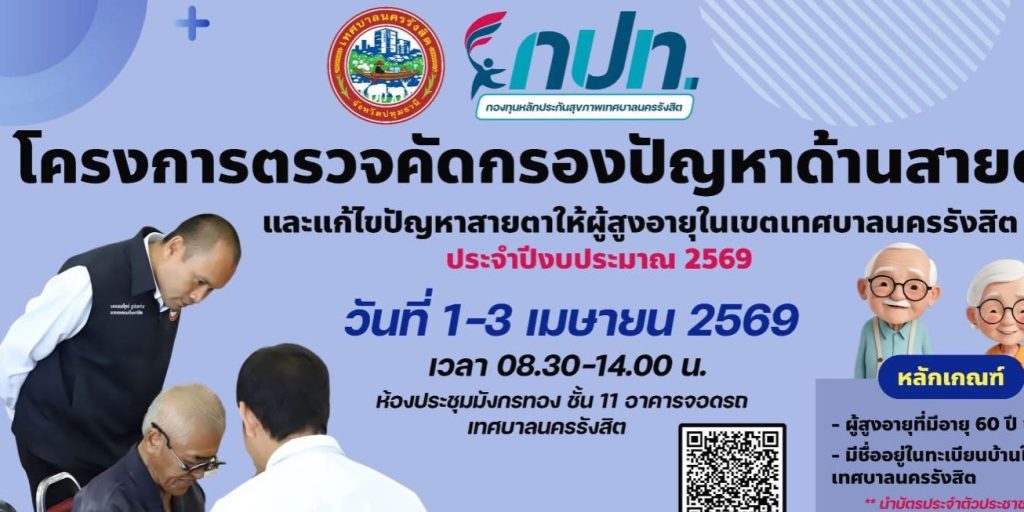 กองทุนหลักประกันสุขภาพเทศบาลนครรังสิต จัดโครงการตรวจคัดกรองปัญหาด้านสายตา และแก้ไขปัญหาสายตาให้ผู้สูงอายุในเขตเทศบาลนครรังสิต ประจำปีงบประมาณ 2569 #ฟรี! #ไม่มีค่าใช้จ่าย