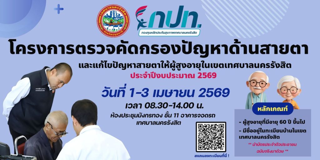 กองทุนหลักประกันสุขภาพเทศบาลนครรังสิต จัดโครงการตรวจคัดกรองปัญหาด้านสายตา และแก้ไขปัญหาสายตาให้ผู้สูงอายุในเขตเทศบาลนครรังสิต ประจำปีงบประมาณ 2569 #ฟรี! #ไม่มีค่าใช้จ่าย
