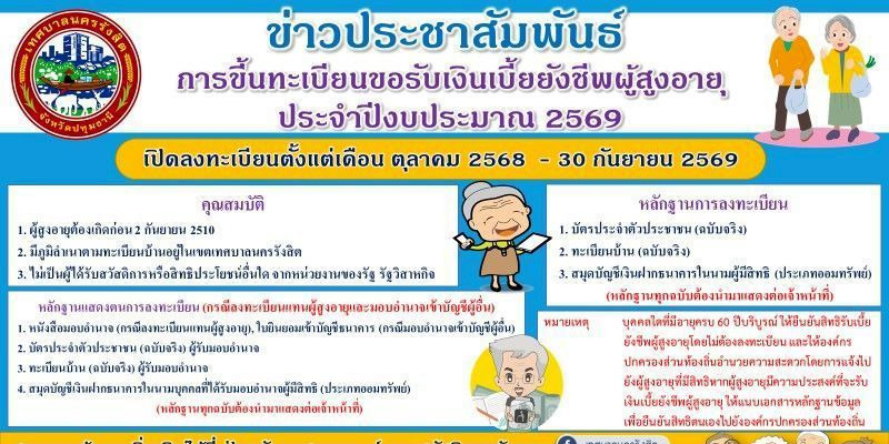 การขึ้นทะเบียนขอรับเงินเบี้ยยังชีพผู้สูงอายุ ประจำปีงบประมาณ 2569 เปิดลงทะเบียนตั้งแต่เดือน ตุลาคม 2568 – 30 กันยายน 2569