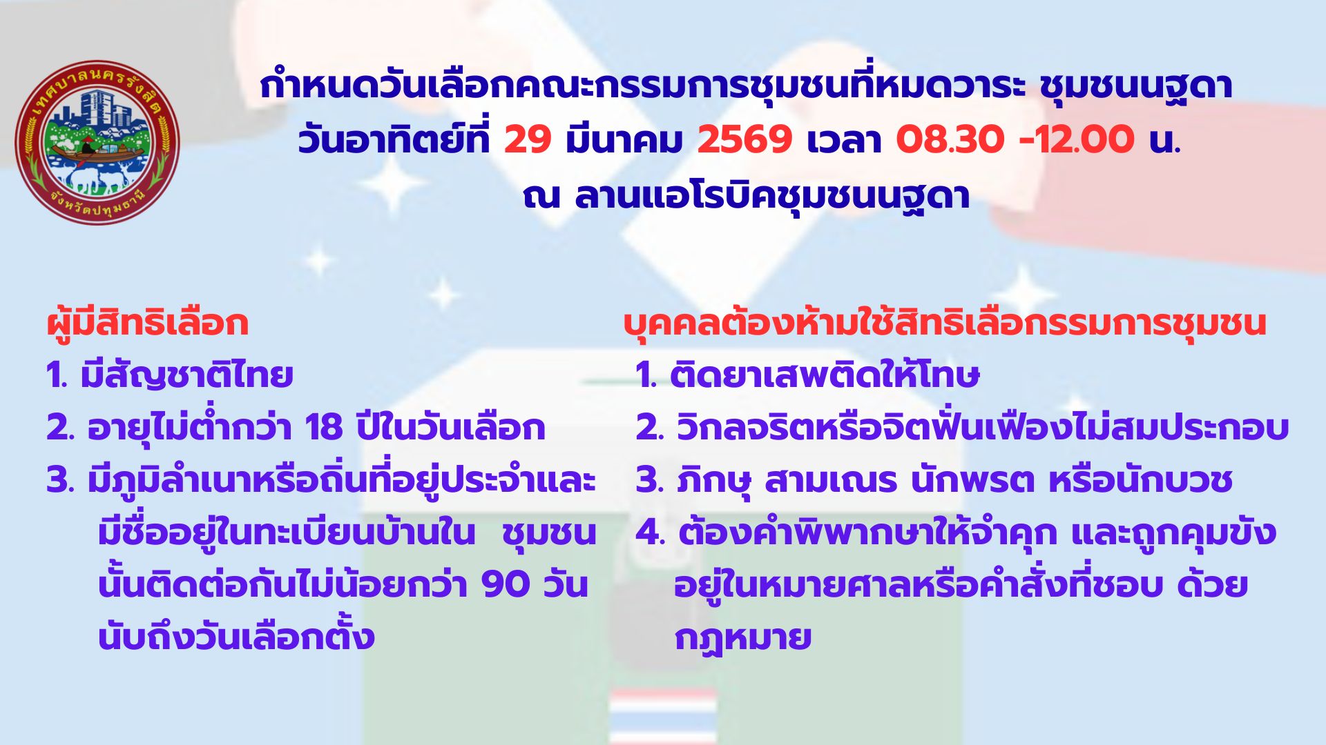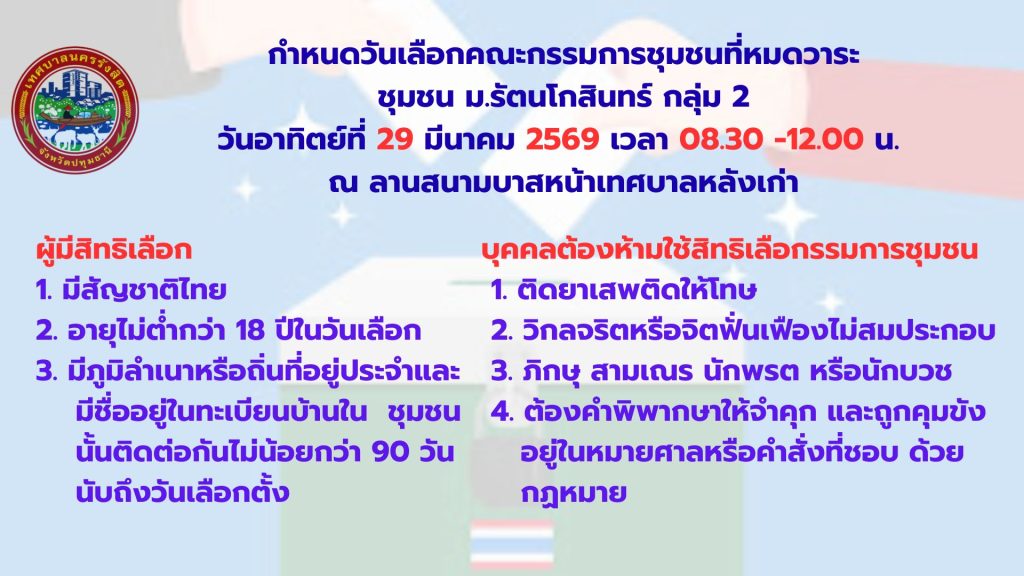 เทศบาลนครรังสิตขอเชิญประชาชนผู้มีสิทธิเลือกคณะกรรมการชุมชนดังกล่าว ออกมาใช้สิทธิ์เลือกคณะกรรมการชุมชนฯ รายละเอียดตามภาพ