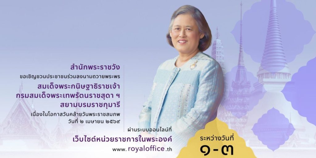 สมเด็จพระกนิษฐาธิราชเจ้า กรมสมเด็จพระเทพรัตนราชสุดา เจ้าฟ้ามหาจักรีสิรินธร มหาวชิราลงกรณวรราชภักดี สิริกิจการิณีพีรยพัฒน รัฐสีมาคุณากรปิยชาติ สยามบรมราชกุมารี เนื่องในโอกาสวันคล้ายวันพระราชสมภพ วันที่ ๒ เมษายน ๒๕๖๙ ผ่านระบบออนไลน์ ที่เว็บไซต์หน่วยราชการในพระองค์ www.royaloffice.th ระหว่างวันที่ ๑ – ๓ เมษายน ๒๕๖๙