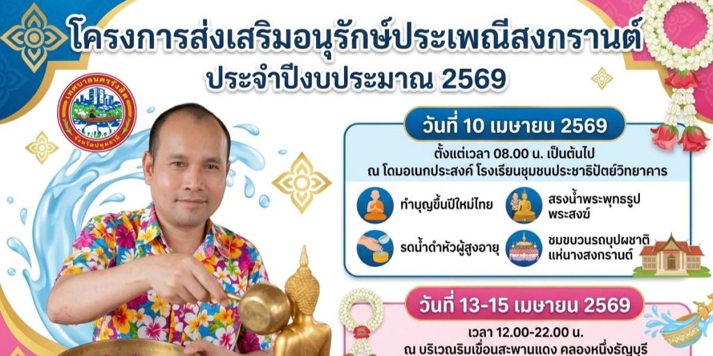 📅 วันที่ 10 เมษายน 2569 🕔 ตั้งแต่เวลา 08.00 น. เป็นต้นไป 📌 ณ โดมอเนกประสงค์ โรงเรียนชุมชนประชาธิปัตย์วิทยาคาร 😇 ทำบุญขึ้นปีใหม่ไทย 🙏 สรงน้ำพระพุทธรูป /พระสงฆ์ 👴 รดน้ำดำหัวผู้สูงอายุ ขอพรผู้ใหญ่ 👵 🛻 ชมขบวนรถบุปผชาติแห่นางสงกรานต์ 🌺 —————————————- #ใครยังไม่มีที่เปียกมาที่นี่!! ✨ ถนนสงกรานต์ สำหรับเล่นสาดน้ำตามแบบวัฒนธรรมไทย 🇹🇭 📅 วันที่ 13-15 เมษายน 2569 🕔 เวลา 12.00 – 22.00 น. 📌 ณ บริเวณริมเขื่อนสะพานแดง คลองหนึ่งธัญบุรี 💦 อุโมงค์น้ำ 🎶 ดนตรี /ศิลปิน /ดีเจ 🫧 ลานโฟม ปาร์ตี้โฟม ✨ ชวนเพื่อน ชวนแก๊ง มาให้ครบ แล้วมาเจอกัน! ⚠️ เล่นน้ำอย่างสุภาพ ปลอดภัย เคารพสิทธิ์ผู้อื่นกันนะ!! จัดโดย กองการศึกษา เทศบาลนครรังสิต #เทศบาลนครรังสิต #เปลี่ยนแปลงนครรังสิตเพื่อคุณภาพชีวิตที่ดีกว่า #นายกโบว์ลิ่ง เผยแพร่โดย : งานประชาสัมพันธ์ ฝ่ายบริการและเผยแพร่วิชาการ กองยุทธศาสตร์และงบประมาณ ——————————– ติดตามข่าวสารเทศบาลนครรังสิต เพื่อไม่พลาดข่าวสารดีๆ 🌐 เว็บไซต์ : www.rangsitcity.go.th 🟢 Line Official : @rangsitcity (ใส่ @ข้างหน้า) หรือคลิกลิงค์ https://lin.ee/mNAHC1Z 🔵 Facebook Page : เทศบาลนครรังสิต คลิกลิงค์ https://www.facebook.com/rangsitcity2016 🔴 YouTube : เทศบาลนครรังสิต คลิกลิงค์ https://youtube.com/@rangsitcity2016/ ⚫ TikTok : https://www.tiktok.com/@rangsitcity_official 📲 แจ้งเรื่องร้องเรียน หรือ ขอรับบริการสาธารณะ ได้ที่ Rangsit City App ดาวน์โหลดแอปพลิเคชั่น Rangsit City App Apple Store (iOS) : ได้ที่ลิงค์ https://apps.apple.com/…/rangsit-city-app/id6472018970… Google Play (Android) : ได้ที่ลิงค์ https://play.google.com/store/apps/details… ☎ โทรศัพท์ : 0 2567 6000 📩 Email : saraban@rangsitcity.go.th 📲 แจ้งเหตุด่วน เหตุร้าย ไฟไหม้ ตลอด 24 ชั่วโมง – ศูนย์ควบคุมและสั่งการนครรังสิต (ศูนย์ RCC) โทร. 0 2567 6000 ต่อ 119 หรือ 0 2567 3388 – ศูนย์กู้ชีพเทศบาลนครรังสิต โทร. 0 2567 4944