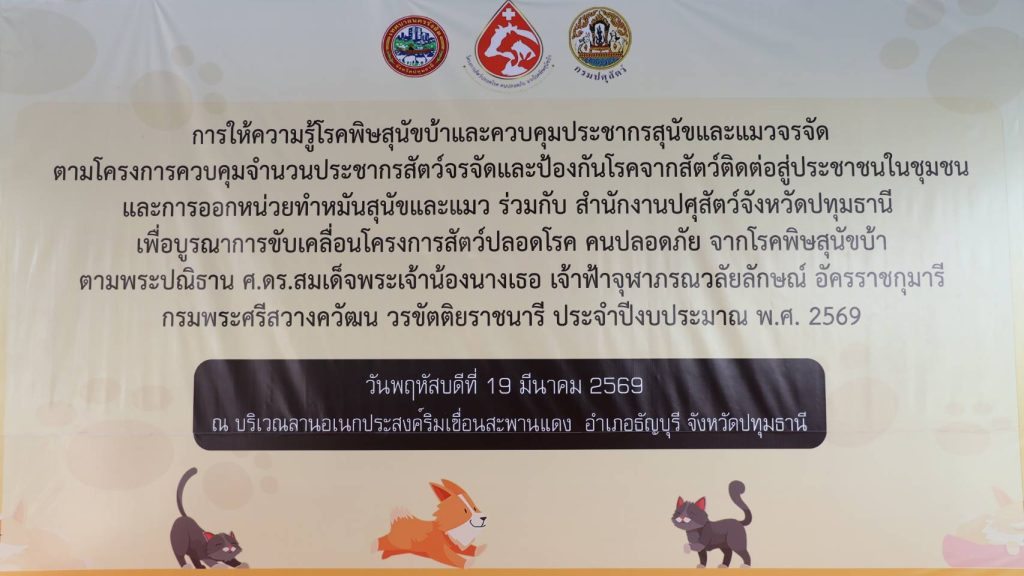 ….. กิจกรรม การอบรมให้ความรู้โรคพิษสุนัขบ้าและควบคุมประชากรสุนัขและแมวจรจัด ตามโครงการควบคุมจำนวนประชากรสัตว์จรจัดและป้องกันโรคจากสัตว์ติดต่อสู่ประชาชนในชุมชนและการออกหน่วยทำหมันสุนัข – แมว ร่วมกับ สำนักงานปศุสัตว์จังหวัดปทุมธานี เพื่อบูรณาการขับเคลื่อนตามพระปณิธาน ศ.ดร. สมเด็จเจ้าฟ้าฯ กรมพระศรีสวางควัฒน วรขัตติยราชนารี ประจำปีงบประมาณ พ.ศ. 2569 ….. วันพฤหัสบดีที่ 19 มีนาคม 2568 เวลา 09.30 น. นายวรรณชัย อิทธิมณีสิริ รองนายกเทศมนตรีนครรังสิต ให้เกียรติเป็นประธานในพิธีเปิด ” กิจกรรม