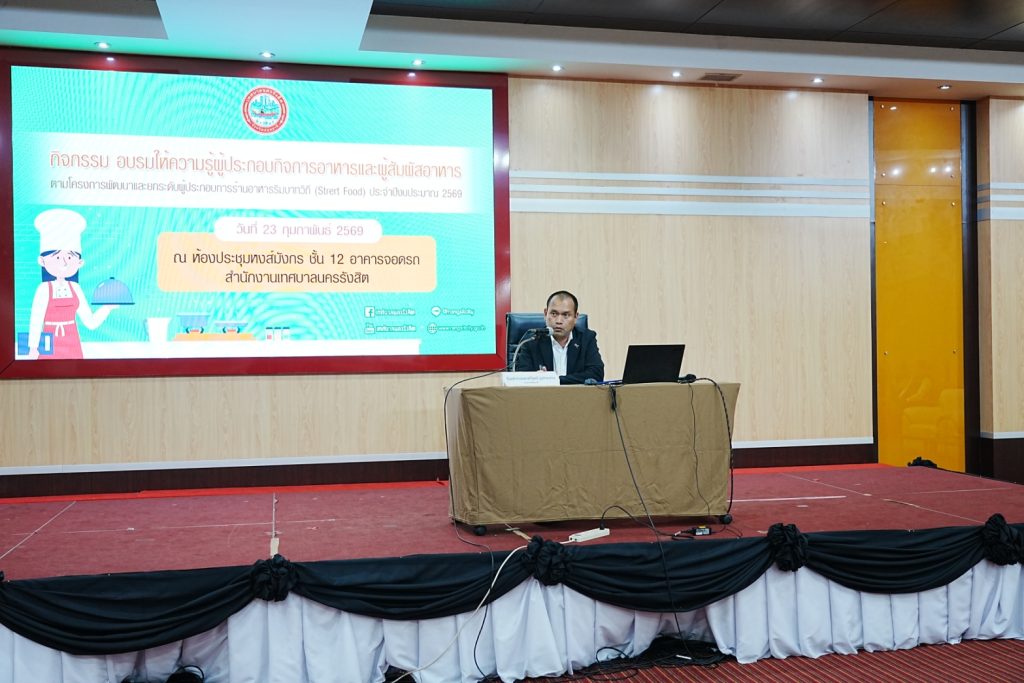 วันที่ 23 กุมภาพันธ์ 2569 เวลา 13.00 น. ณ ห้องประชุมหงส์มังกร ชั้น 12 อาคารจอดรถเทศบาลนครรังสิต ร้อยตำรวจเอก ดร.ตรีลุพธ์ ธูปกระจ่าง นายกเทศมนตรีนครรังสิต เป็นประธานในพิธีเปิดโครงการอบรมให้ความรู้ผู้ประกอบกิจการอาหารและผู้สัมผัสอาหาร ตามโครงการพัฒนาและยกระดับผู้ประกอบการร้านอาหารริมบาทวิถี (Street Food) พร้อมประชุมผู้ค้าริมบาทวิถี ถนนคนเดินนครรังสิต “เดิน กิน ชิม เที่ยว” Walking Street @Rangsit โดยมี