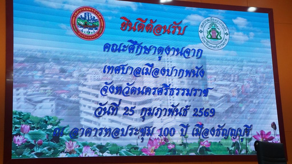 วันที่ 25 กุมภาพันธ์ 2569 เวลา 09.00 น. ณ อาคารหอประชุม 100 ปี เมืองธัญญูบูรี อำเภอธัญบุรี จังหวัดปทุมธานี ร้อยตำรวจเอก ดร.ตรีลุพธ์ ธูปกระจ่าง นายกเทศมนตรีนครรังสิต มอบหมาย นางสาวอรุณรัตน์ มงคลพิทักษ์กุล รองนายกเทศมนตรีนครรังสิต ให้เกียรติเป็นประธานกล่าวต้อนรับคณะศึกษาดูงานจาก เทศบาลเมืองปากพนัง จังหวัดนครศรีธรรมราช นำโดย นายขวัญชัย รอดมณี นายกเทศมนตรีเมืองปากพนัง พร้อมคณะ