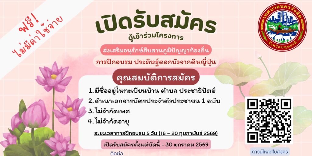 ประชาสัมพันธ์ เปิดรับสมัครผู้เข้าร่วมโครงการส่งเสริมอนุรักษ์สืบสานภูมิปัญญาท้องถิ่น การฝึกอบรม ประดิษฐ์ดอกบัวจากดินญี่ปุ่น ระยะเวลาการฝึกอบรม วันที่ 16-20 กุมภาพันธ์ 2569 (จันทร์ – ศุกร์) เวลา 08.30 น. – 16.30 น. ณ ห้องประชุมมังกรทอง ชั้น 11 เทศบาลนครรังสิต คุณสมบัติ – มีทะเบียนบ้านอยู่ในเขตตำบลประชาธิปัตย์ – ไม่จำกัดอายุ ไม่จำกัดเพศ เปิดรับสมัครตั้งแต่บัดนี้