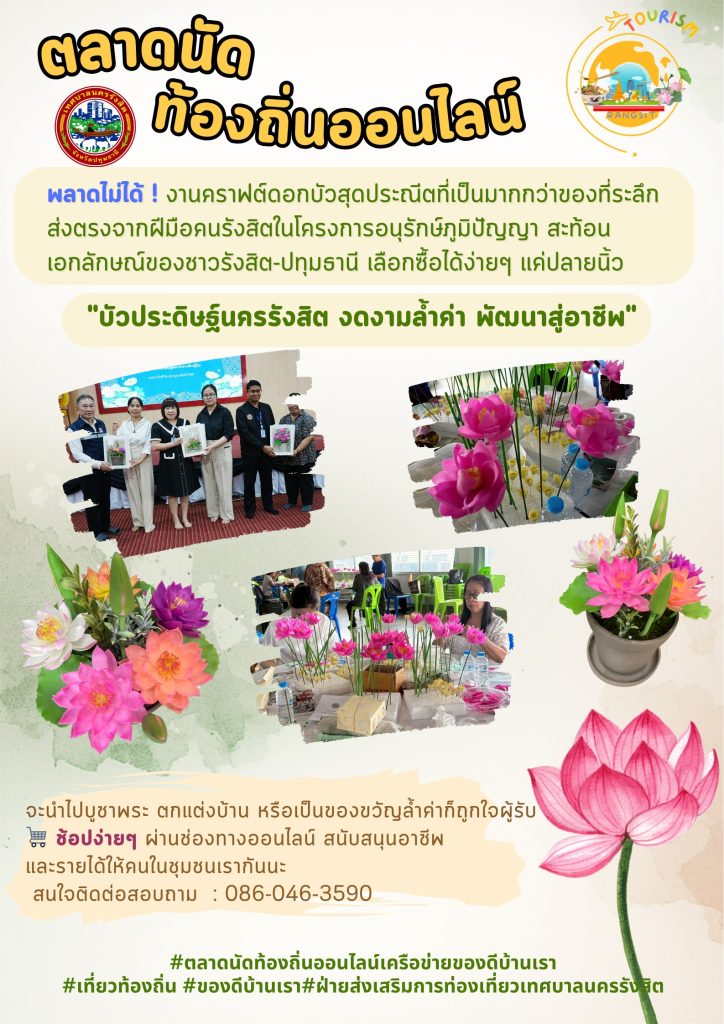 ตลาดนัดท้องถิ่นออนไลน์ เทศบาลนครรังสิตวันนี้ขอนำเสนอ >>บัวประดิษฐ์<< ร่วมอนุรักษ์สัญลักษณ์แห่งเมืองปทุมธานี ผ่านงานฝีมือดอกบัวประดิษฐ์ที่วิจิตรบรรจง จากโครงการส่งเสริมและสืบสานภูมิปัญญาท้องถิ่นสู่การสร้างอาชีพที่ยั่งยืน “ดอกบัวงามคู่เมืองปทุม สร้างงาน สร้างรายได้ สืบสานสายใยชุมชน” พลาดไม่ได้! งานคราฟต์ดอกบัวสุดประณีตที่เป็นมากกว่าของที่ระลึก ส่งตรงจากฝีมือคนรังสิตในโครงการอนุรักษ์ภูมิปัญญา เลือกซื้อได้ง่ายๆ แค่ปลายนิ้ว จะนำไปบูชาพระ ตกแต่งบ้าน หรือเป็นของขวัญล้ำค่าก็ถูกใจผู้รับ 🛒 ช้อปง่ายๆ ผ่านช่องทางออนไลน์ สนับสนุนอาชีพ และรายได้ให้คนในชุมชนเรากันนะ สนใจติดต่อได้ที่ : 086-046-3590 #ตลาดนัดท้องถิ่นออนไลน์เครือข่ายของดีบ้านเรา #เที่ยวท้องถิ่น #ของดีบ้านเรา #ฝ่ายส่งเสริมการท่องเที่ยวเทศบาลนครรังสิต
