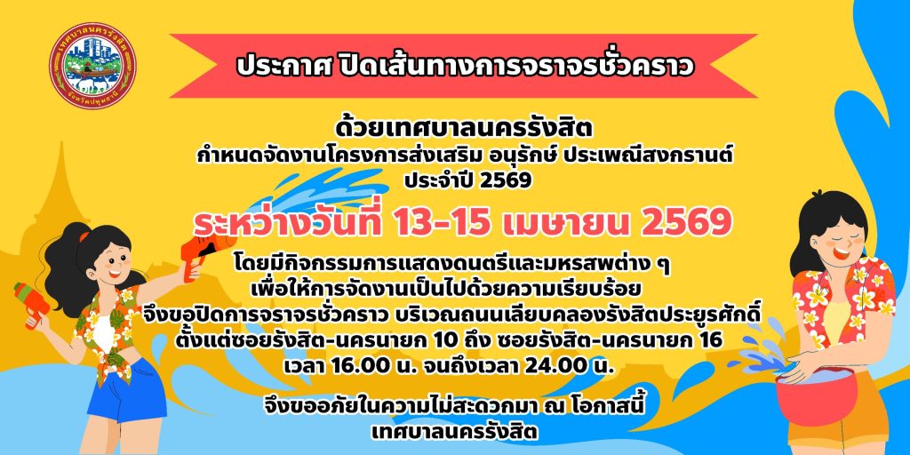 ด้วยเทศบาลนครรังสิต กำหนดจัดงานโครงการส่งเสริม อนุรักษ์ ประเพณีสงกรานต์ ประจำปี 2569 ระหว่างวันที่ 13-15 เมษายน 2569 โดยมีกิจกรรมการแสดงดนตรีและมหรสพต่างๆ เพื่อให้การจัดงานเป็นไปด้วยความเรียบร้อย จึงขอปิดการจราจรชั่วคราว บริเวณถนนเลียบคลองรังสิตประยูรศักดิ์ ตั้งแต่ซอยรังสิต-นครนายก 10 ถึง ซอยรังสิต-นครนายก 16 ตั้งแต่เวลา 16.00 น. จนถึงเวลา 24.00 น. จึงขออภัยในความไม่สะดวกมา ณ โอกาสนี้ #เทศบาลนครรังสิต #เปลี่ยนแปลงนครรังสิตเพื่อคุณภาพชีวิตที่ดีกว่า